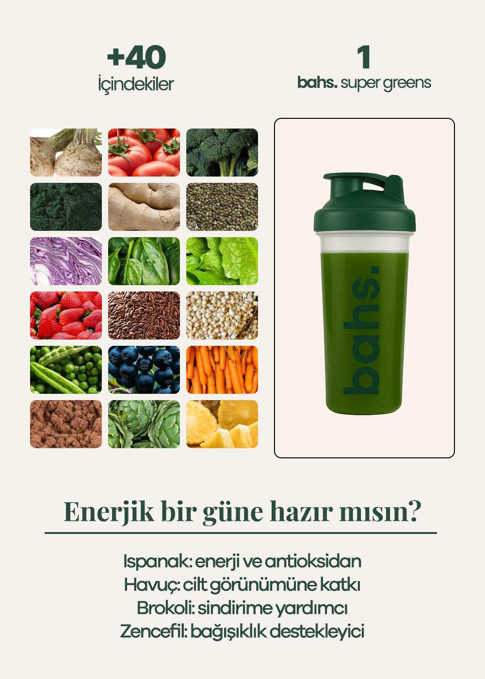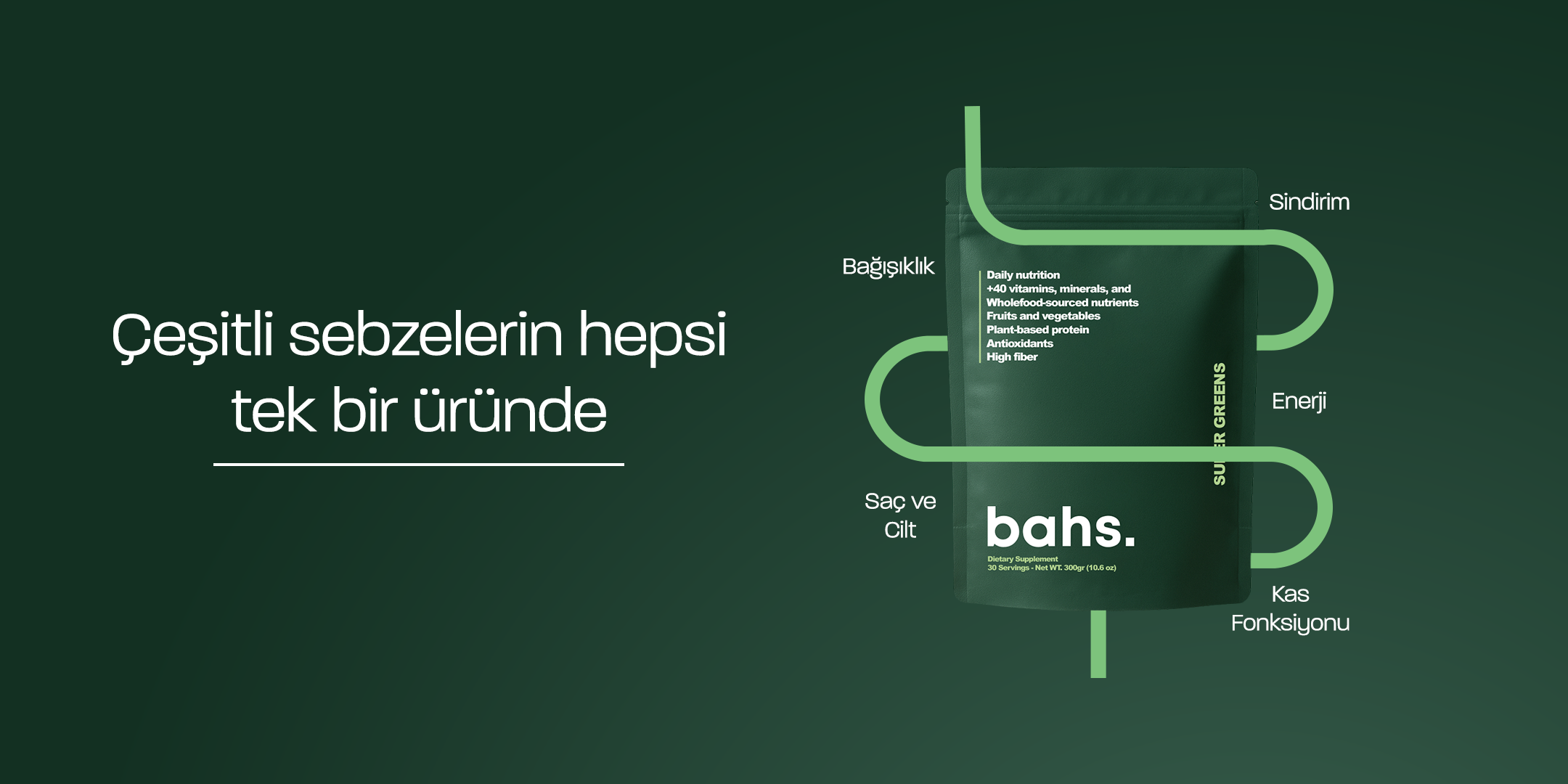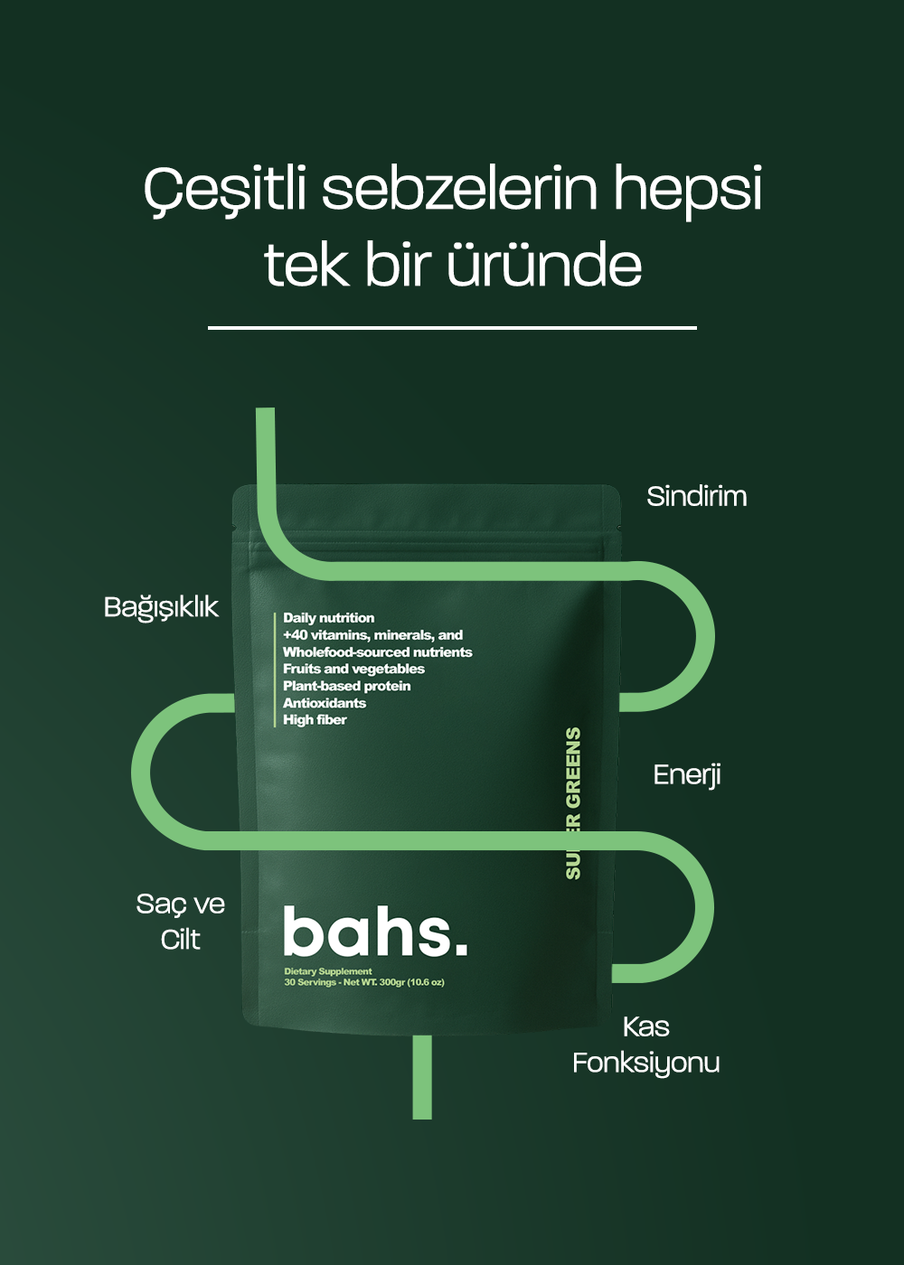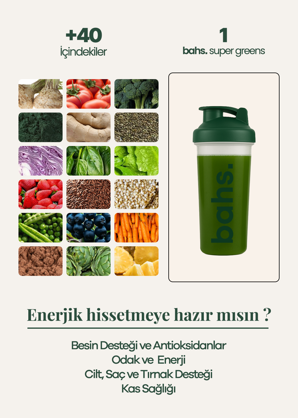 bahs. Super Greens, sadece bir takviye değil, günlük yaşamı kolaylaştıran, sindirimi destekleyen ve vücut fonksiyonlarını dengeleyen kapsamlı bir besin kaynağıdır